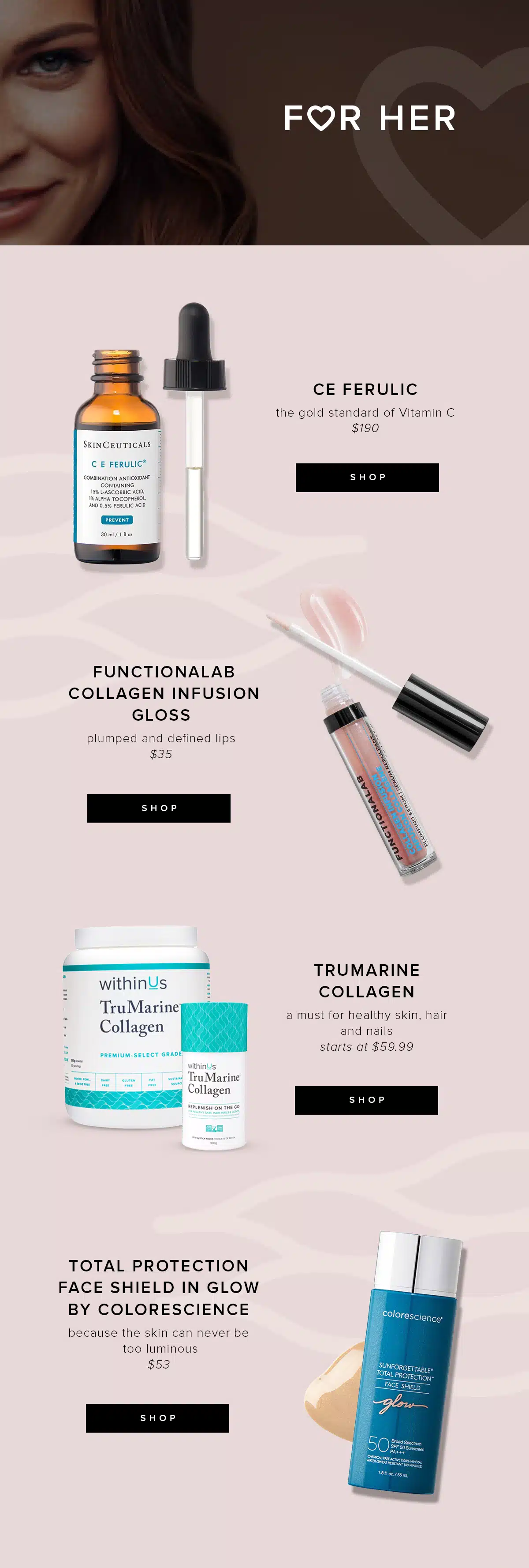 1- CE Ferulic by SkinCeuticals / 2- Collagen Lip Infusion Gloss by Functionalab / 3- TruMarine Collagen by WithinUs / 4- Face Shield Glow by Colorescience